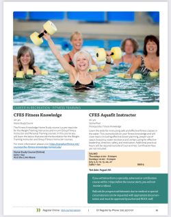 This course will teach you foundation knowledge and instructor skills to successfully complete CFES Aquafit Instructor certification — enabling you to program and lead basic water fitness classes.
